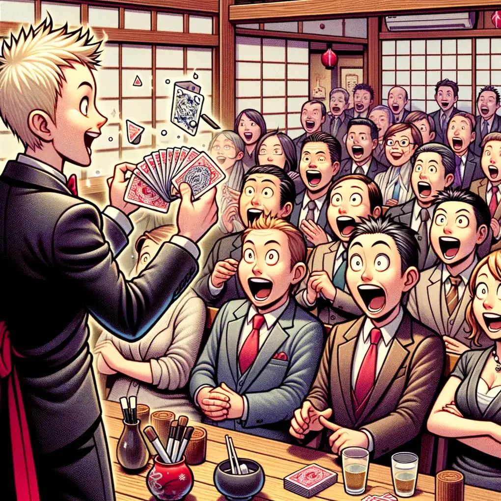 「料亭でのマジックショー、盛り上がりすぎて料理が飛んできそうでしたね。まさに、"飛び出す" コース料理!」