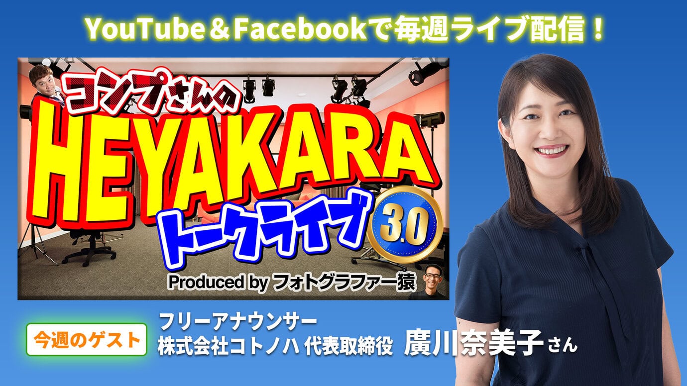 7/1(木)『コンプさんのHEYAKARAトークライブ3.0(vol.59)』のゲストはフリーアナウンサーで株式会社コトノハ代表取締役 廣川奈美子さんの登場です!