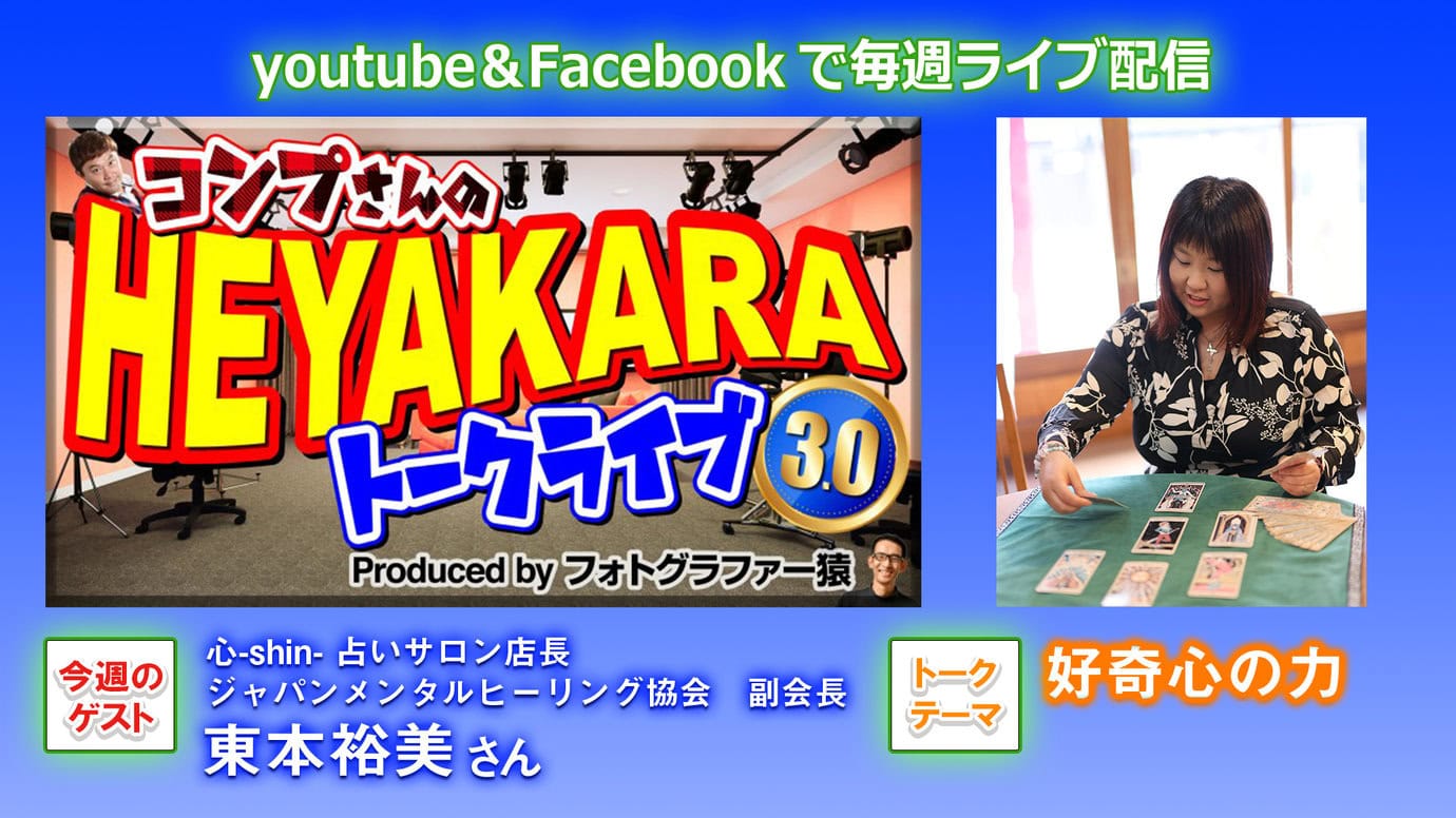 8/15日(日)『コンプさんのHEYAKARAトークライブ3.0(vol.65)』のゲストは、心-Shin- グループ 占いサロン店長で、ジャパン・メンタル・ヒーリング協会 副会長の東本裕美さんさんが登場!