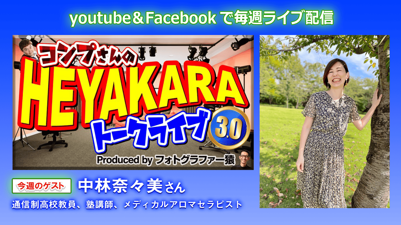 9/19(日)19時~20時『コンプさんのHEYAKARAトークライブ3.0(vol.69)』、今週のゲストは、通信制高校教員であり、塾講師であり、メディカルアロマセラピストの中林奈々美さんです!