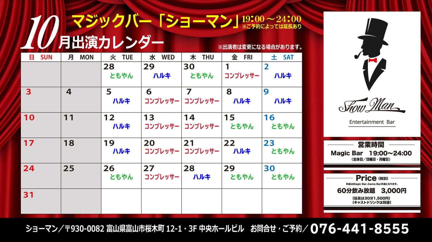10月のマジックバーショーマンのカレンダーをつくりましたぁ~☆明日10月1日はコンプ出演ですよ~(^^♪