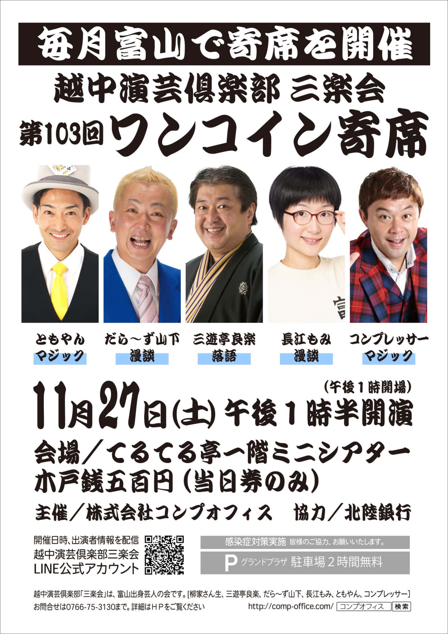 毎月開催している越中演芸倶楽部三楽会「ワンコイン寄席」今月は11月27日(土)の開催ですー!