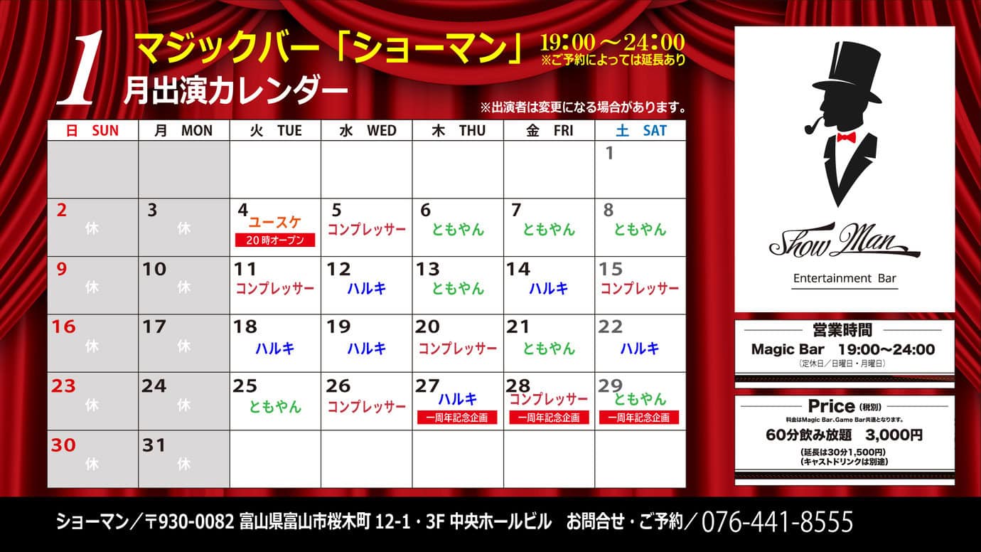 富山市桜木町マジックバーショーマン、本年もよろしくお願いします!1月の営業カレンダーですー!