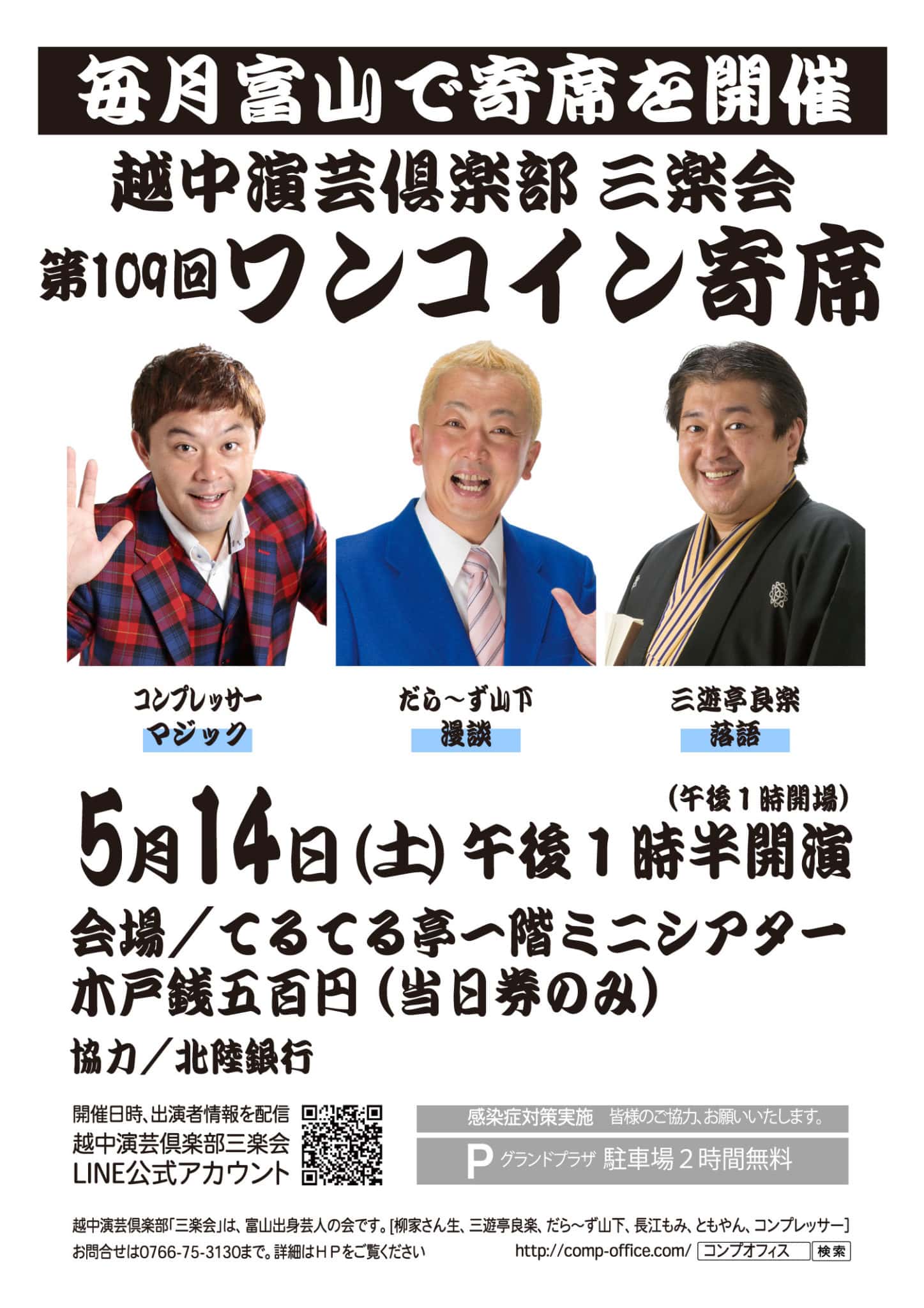 今度の土曜日、5月14日(土)は三楽会ワンコイン寄席を開催!