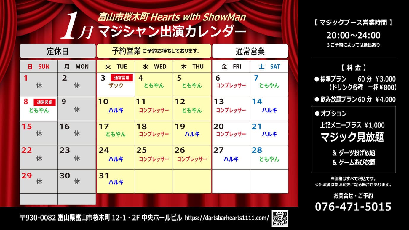 桜木町マジックバー・ショーマン1月の営業カレンダー更新!