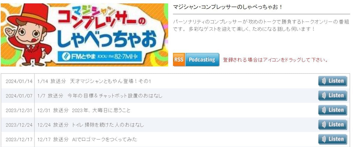 「コンプレッサーのしゃべっちゃお!」は、僕の日常や思いをマジシャンならではの視点でお届けしています。FMとやまポッドキャストで、いつでもどこでもお楽しむことができます。通勤中やリラックスタイムにぜひ聴いてみてくださいね!
