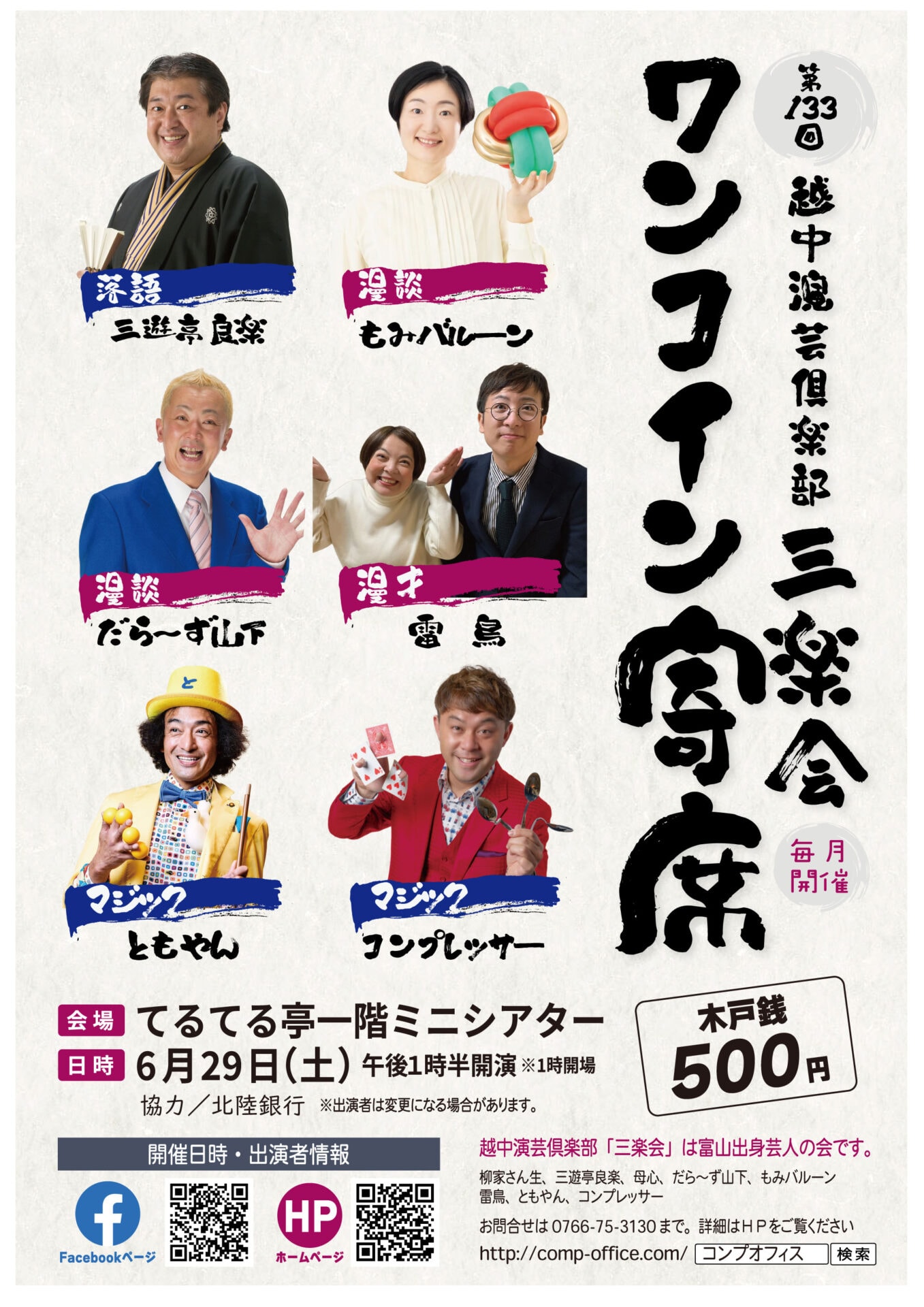 越中演芸倶楽部三楽会「ワンコイン寄席」、6月は29日(土)に開催いたします!