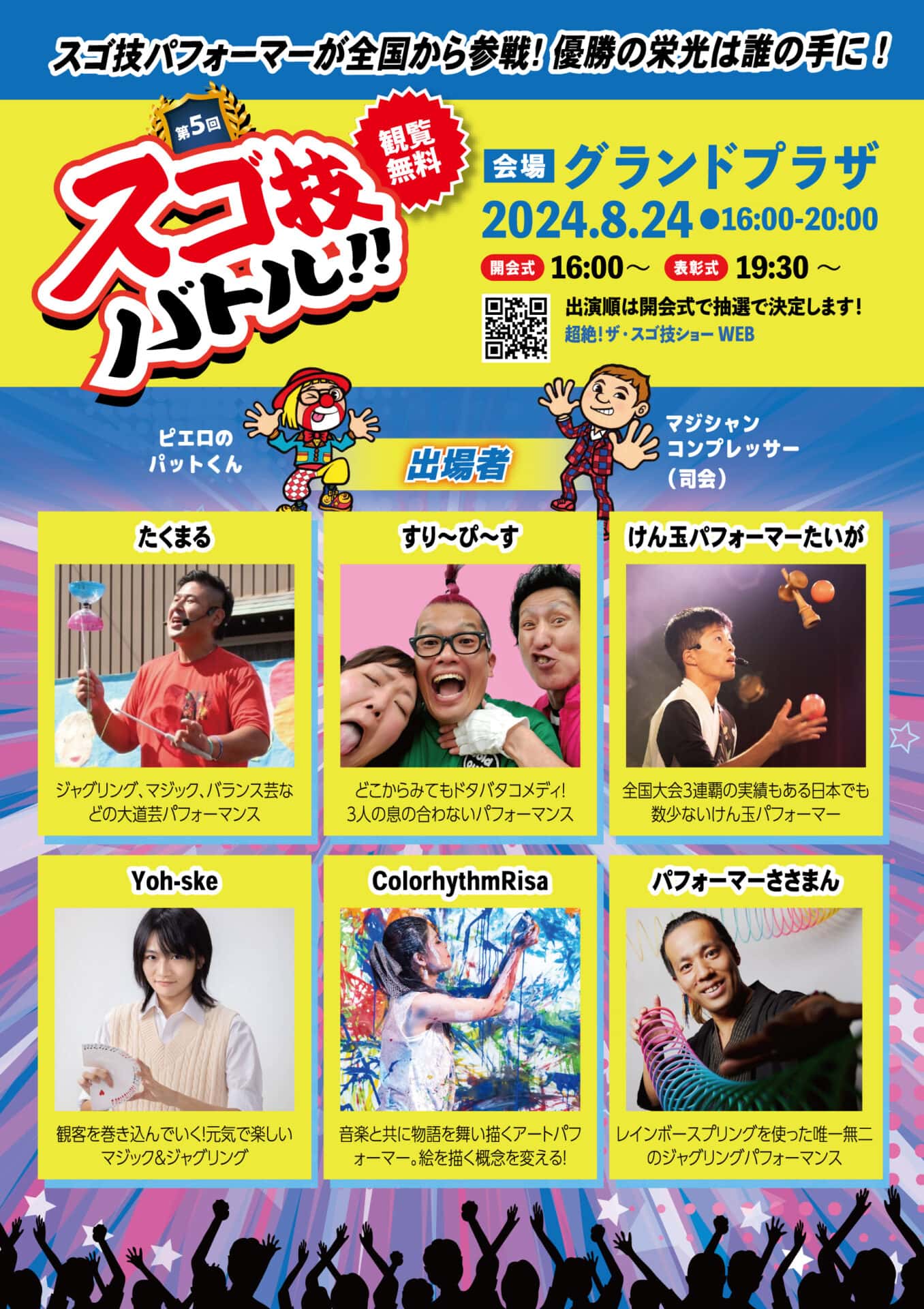「スゴ技バトル!!」は2024年8月24日(土)16:00~20:00に、グランドプラザにて開催されます。開会式は16:00からスタート、そして19:30からは表彰式が行われます。熱いパフォーマンスが目白押しのイベントを、どうぞお楽しみに!