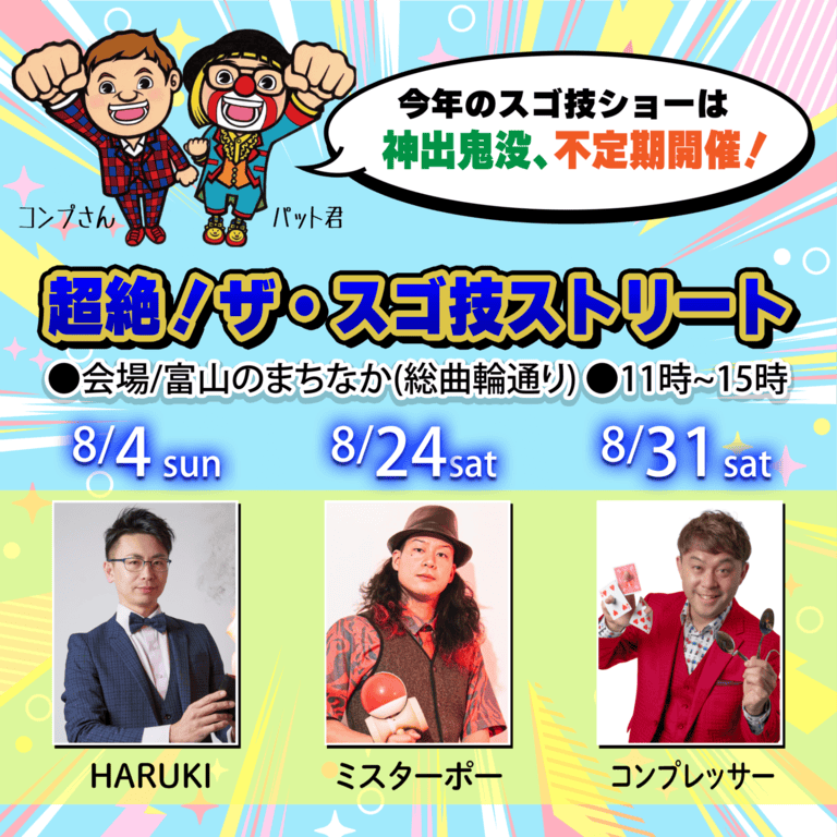 「超絶!ザ・スゴ技ストリート」は今日も絶賛開催中です☆ そして、2024年の「スゴ技ショー」では、もっと驚きのパフォーマンスが富山のまちなかで待っているかもしれません!PRページで最新情報をチェックして、見逃さないようにしてください♪