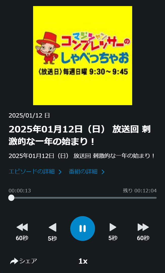 皆さんこんにちは!マジシャンのコンプレッサーです。「コンプレッサーのしゃべっちゃおう」2025年最初の放送にようこそ!毎週お付き合いいただいているリスナーの皆さん、今年もどうぞよろしくお願いします。