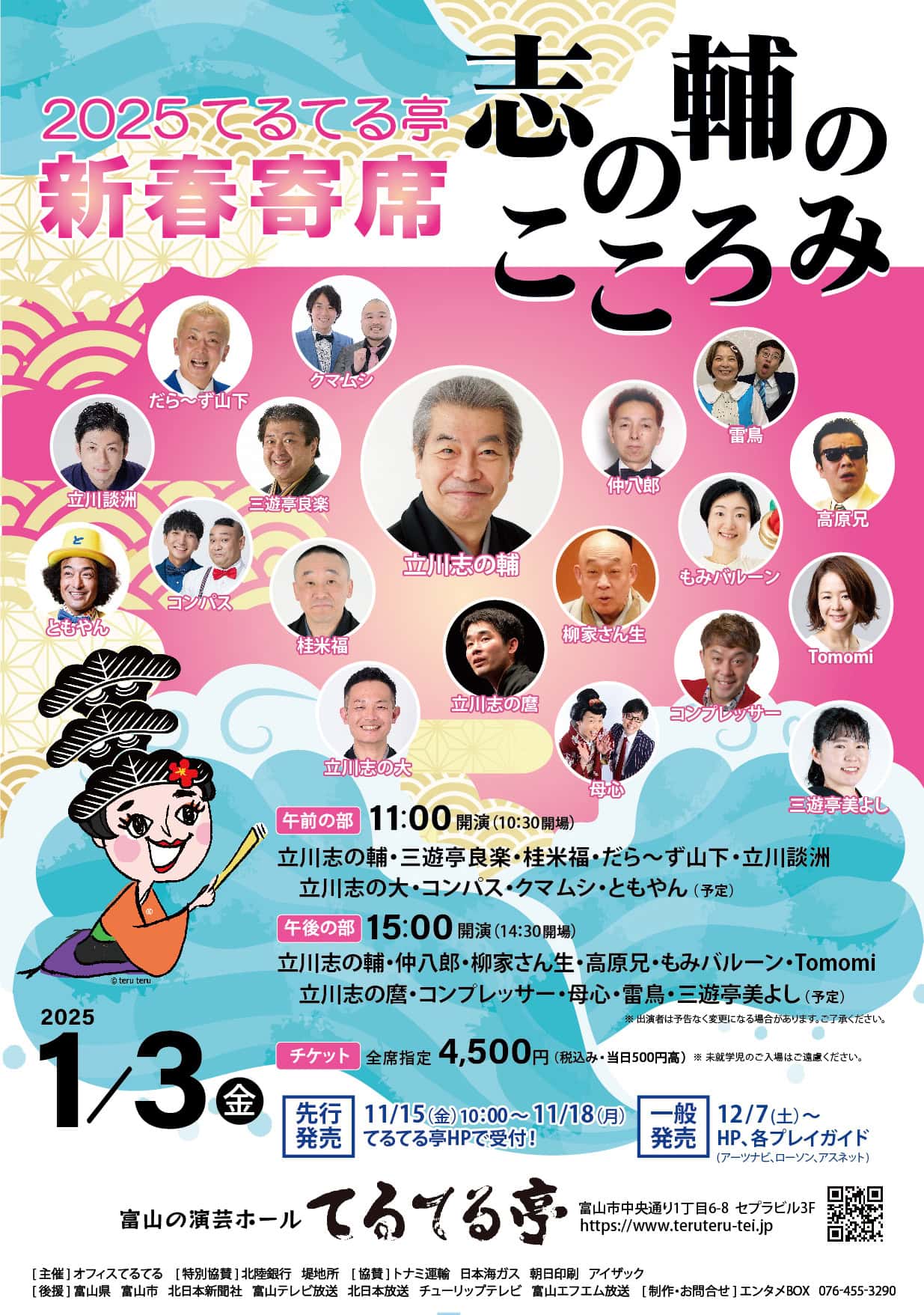 富山県の新春を盛り上げる恒例のイベント「てるてる亭 新春寄席:志の輔のこころみ」が、2025年1月3日(金)に開催されます。昨年は地震の影響で中止となりました。今年はその分も含めて、特別な舞台をお届けするため、心を込めて準備を進めています!皆さんに笑顔と感動をお届けできるこの機会、心から楽しみにしています。