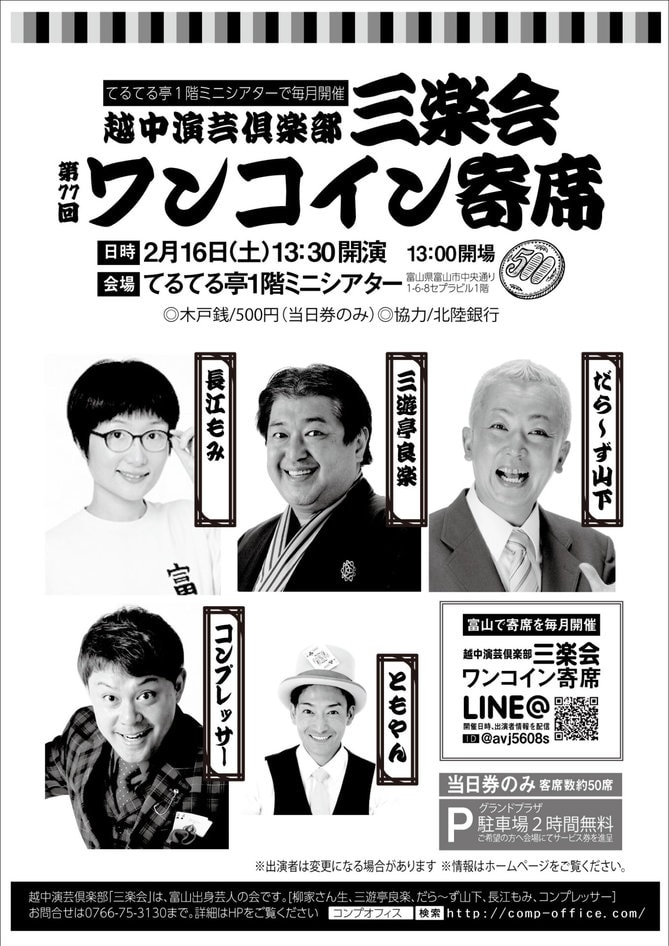 2月16日(土)開催!第77回越中演芸倶楽部三楽会ワンコイン寄席情報