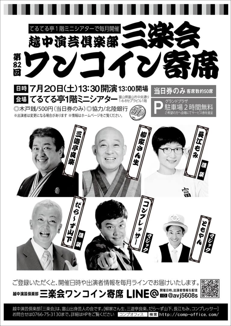 7月20日に開催 越中演芸倶楽部三楽会ワンコイン寄席 2019年7月1日 最終更新日時 : 2019年7月1日 コンプさん 富山市中央通りてるてる亭1階ミニシアターで、毎月寄席を開催しています。木戸銭はなんとワンコインの500円。小さな寄席ならではの魅力をお気軽にどうぞ! 越中演芸倶楽部三楽会は、柳家さん生(落語)、三遊亭良楽(落語)、だら~ず山下(漫談)、長江もみ(漫談)、コンプレッサー(マジック)が所属する富山の会です。 三楽会LINE@公式アカウント お友だちになると、開催日時や出演者情報をラインでお届けいたします。 FacebookXBlueskyCopy