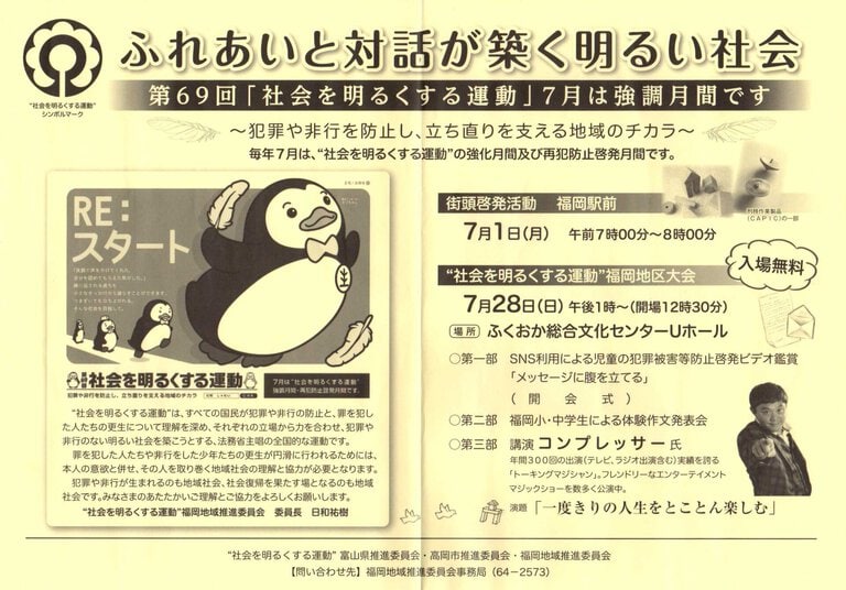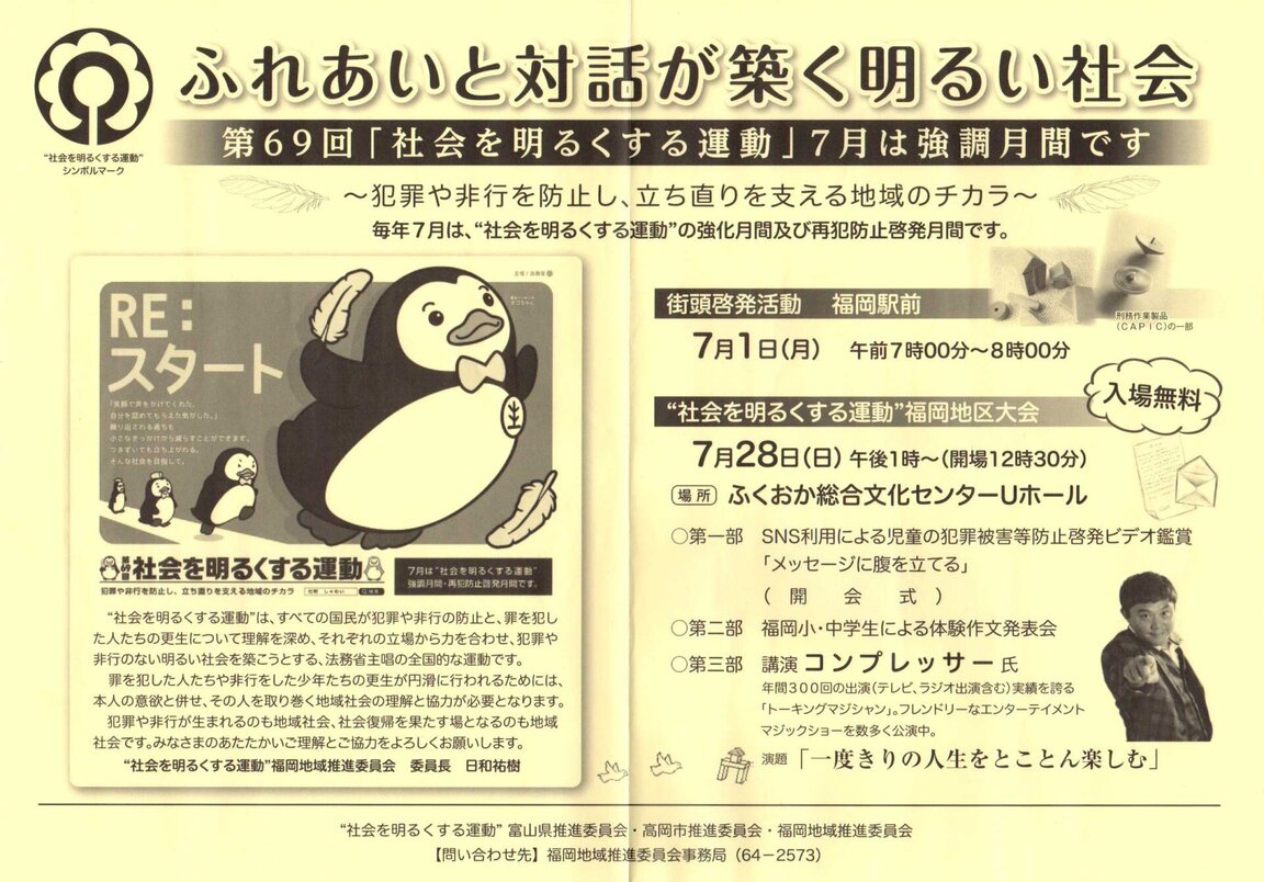 ふれあいと対話が築く明るい社会「社会を明るくする運動・福岡地区大会」で講演!演題は「一度きりの人生をとことん楽しむ」です。マジックショーとおしゃべりの訳45分をお楽しみください!