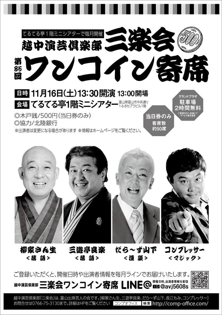 11月16日(土)に開催開催、越中演芸倶楽部三楽会ワンコイン寄席 2019年11月6日 最終更新日時 : 2019年11月6日 コンプさん 富山市中央通りてるてる亭1階ミニシアターで、毎月寄席を開催しています。木戸銭はなんとワンコインの500円。小さな寄席ならではの魅力をお気軽にどうぞ! 越中演芸倶楽部三楽会は、柳家さん生(落語)、三遊亭良楽(落語)、だら~ず山下(漫談)、長江もみ(漫談)、コンプレッサー(マジック)が所属する富山の会です。 三楽会LINE@公式アカウント お友だちになると、開催日時や出演者情報をラインでお届けいたします。 FacebookXBlueskyCopy