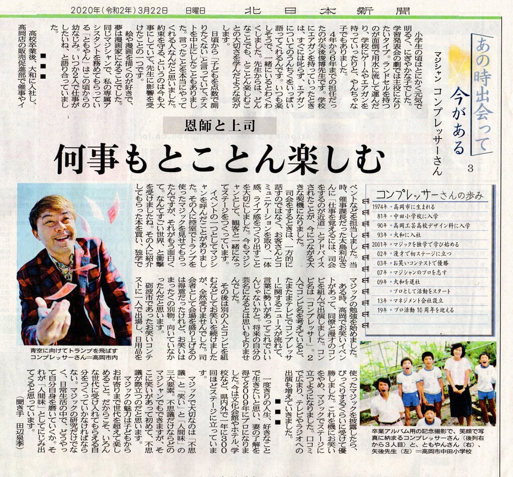 2020.03.22 北日本新聞『あの時出会って今がある』で取り上げていだきました!『マジシャン コンプレッサーさん 恩師と上司』
