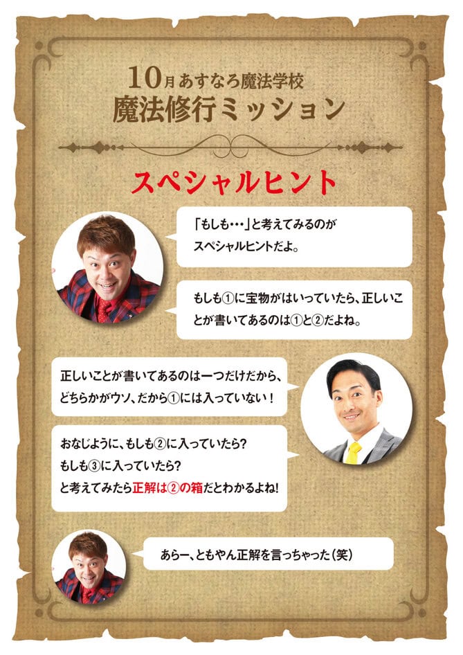 あすなろ魔法学校「10月の魔法の書」スペシャルヒント 2020年9月29日 最終更新日時 : 2020年9月29日 コンプさん あすなろ小児歯科医院で開催している「マジックショー」で配布している「魔法修行ミッション(10月)」のスペシャルヒントです! FacebookXBlueskyCopy