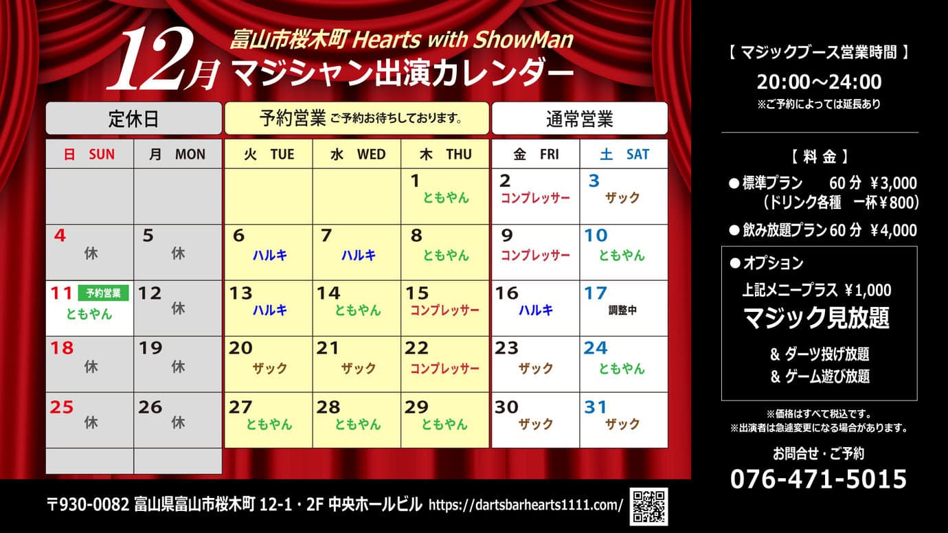 富山 Hearts With ShowMan  12月マジシャン営業カレンダー