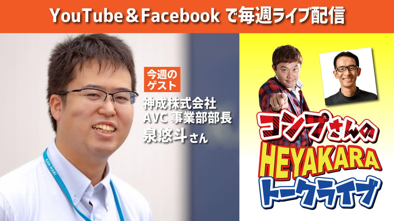 6/5(vol.56)の『コンプさんのHEYAKARAトークライブ2.0』、コロナ禍で急激に需要が延びたインターネットでのライブ配信ですが、今回のゲストは、全国でもそのトップの技術力を誇るエキスパート、誰もが知っている著名アーティストのライブ配信なども数多く手がけている神成株式会社 AVC事業部部長の泉悠斗さんです!