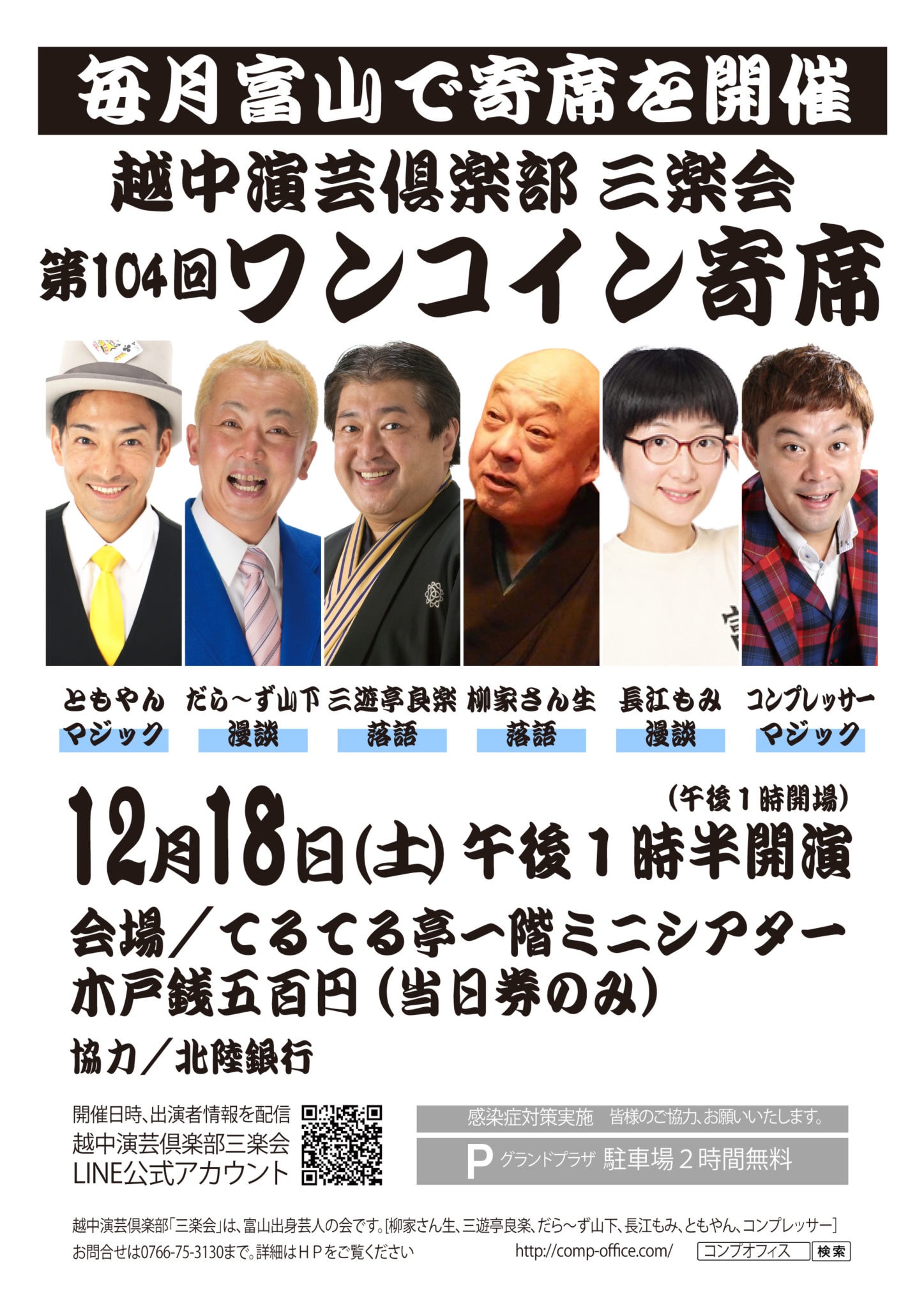 12月18日(土)は今年最後の三楽会ワンコイン寄席を開催!全員出演のお得な会です~☆皆様のご来場お待ちしております!! 2021年12月16日 最終更新日時 : 2026年3月7日 コンプさん 12月18日(土)は今年最後の三楽会ワンコイン寄席を開催! 全員出演のお得な会です~☆ 皆様のご来場お待ちしております!! \ 最新情報をチェック / @ing3comp FacebookXBlueskyCopy